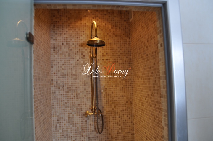 Здесь присутствуют двухуровневые потолки, паркет сложной укладки, керамическая плитка, мозаика в санузлах, обои со строго-прорисованным рисунком, большое количество светильников и бра.